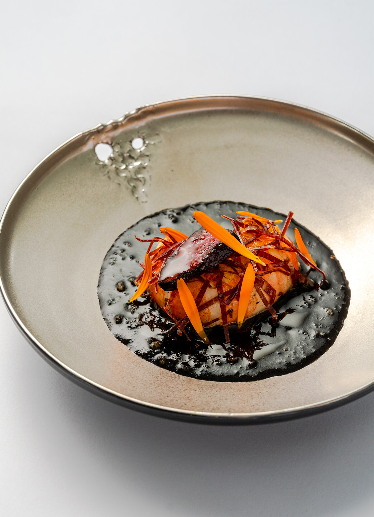 繊細な甘味があるアカザエビは、イカ墨、生ハム、鳩の肝でとろみをつけたブイヤベースソースを添えて。「Langoustine d’Écosse」