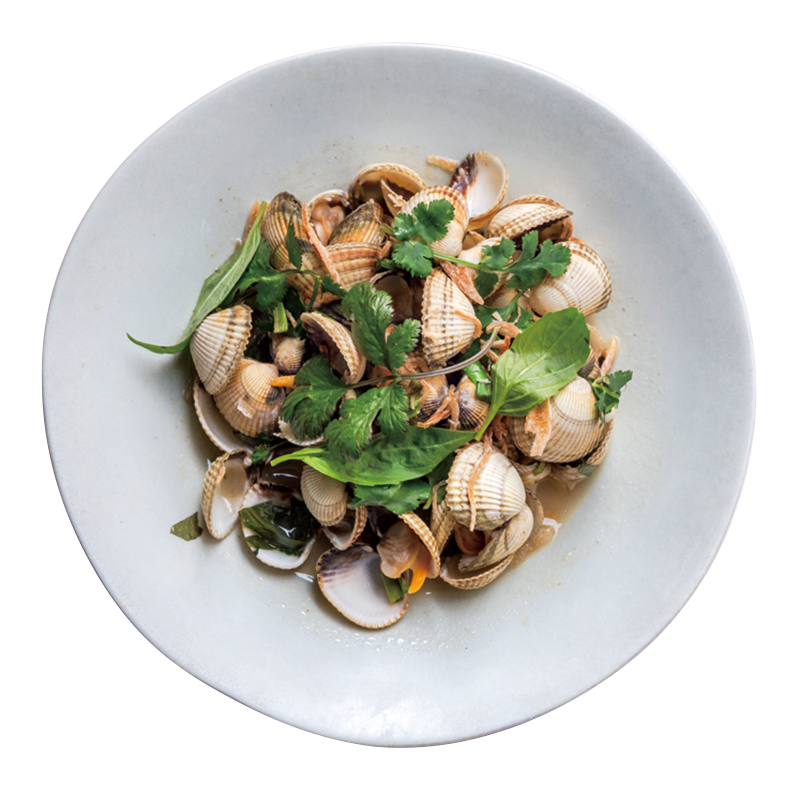 魚介類はノルマンディとブルターニュの漁師から直送。ザル貝のガラムマサラバター風味「Coques, Beurre Blanc au Garam Masala」14ユーロ