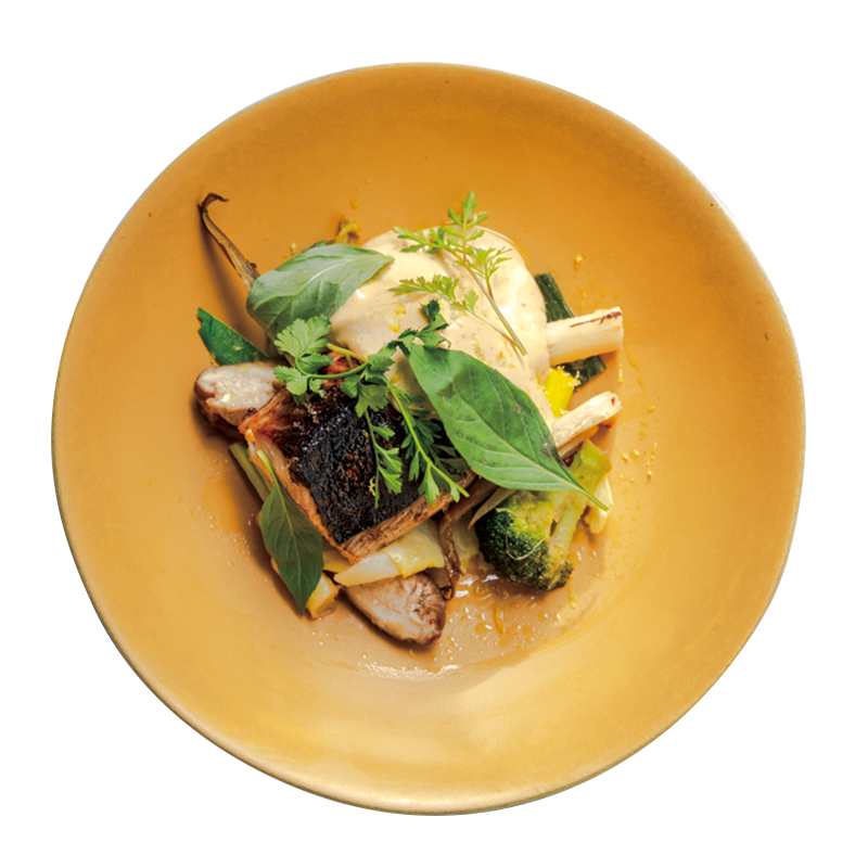 36ユーロのランチコースから。タラをオリーブオイルで煮て、ニンニクと唐辛子で辛味を加えたスペイン・バスク地方のソース、ピルピルを添えたカツオ料理「Bonite, Sauce Pilpil Piment」。パリ近郊で育てた有機栽培の野菜も美味。