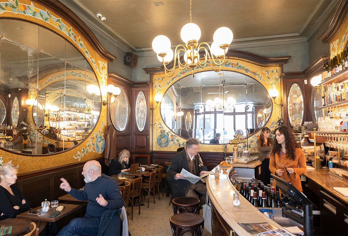 約20席の小さなビストロ。アールヌーボーのモザイクや鏡の美しさだけでなく、バターをしっかり使いつつ、ビネガーやマスタードシード、柑橘による酸味、燻製香を生かした工夫あふれる料理が魅力で、ついリピート。野菜が主役のランチプレートも、香ばしく焼いたり、クリームやチーズのソースと合わせているので食べごたえ十分。カウンターで仕上げをする料理人のきびきびした姿も印象的です。