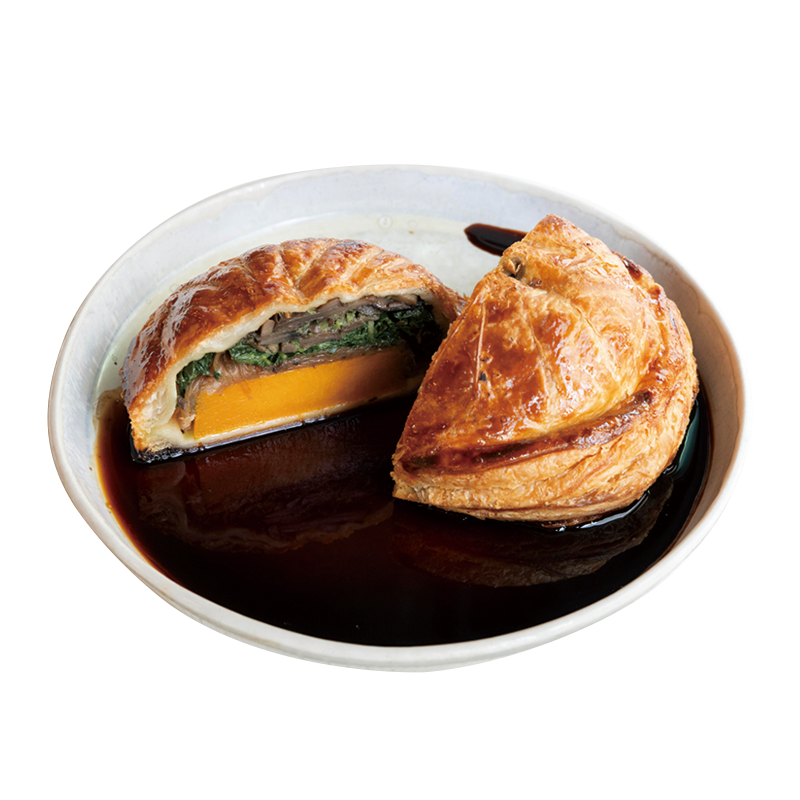 アニスやコリアンダーシードと野菜を煮詰めたソースの濃厚さに驚かされる。カボチャ、玉ネギ、ケール、パセリ風味のキノコを重ねてパイで包んだ「Tourte aux Légumes, Salade, Jus de Légumes」23ユーロ