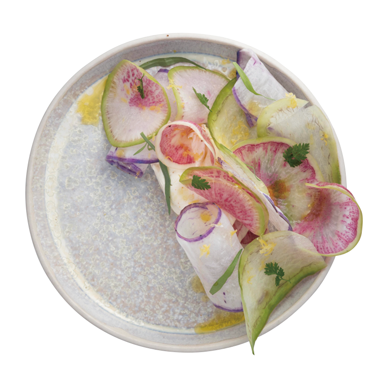 スライスしたラディッシュに、燻製塩を加えてホイップしたバター、ベルガモットのピールとオリーブオイル、ハーブを添えた「Radis Colorés & Mousse de Beurre Fumé」8.50ユーロ