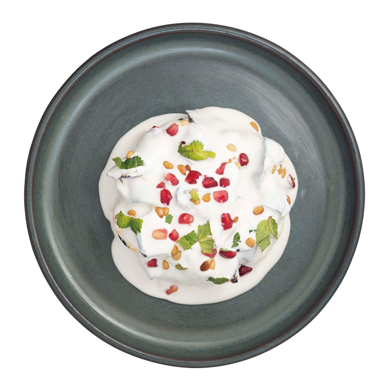 蒸したナスにタヒニとヨーグルトのソースをかけてザクロをちらした「Fatté Aubergine-Aubergines, Miso, Grenade, Yaourt, Tahini」14ユーロ。日本好きのオーナーはナスを味噌でアレンジして、中東の伝統料理のファッテをアレンジ。