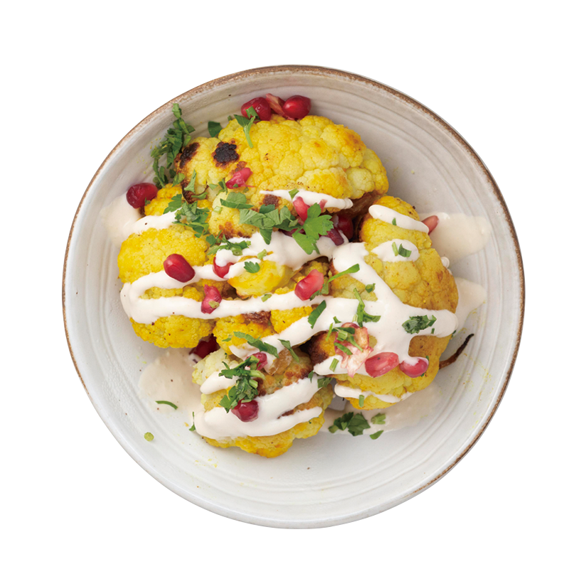 ターメリックで味付けしてローストしたカリフラワーにタヒニソースとザクロをかけた「Chou-fleur Rôti, Tahini, Curcuma, Grenades」10ユーロ。歯ごたえを残しつつ、口中でほろほろとくずれる。