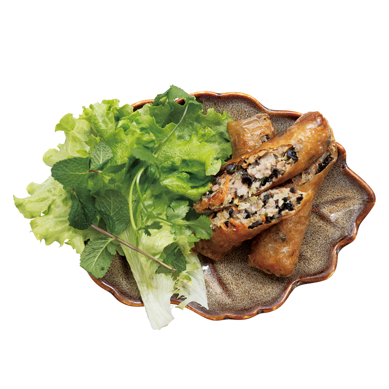 豚ひき肉にキノコ、シイタケ、オーガニック野菜、緑豆の春雨を薄いライスペーパーに包んで揚げたネム「Ăn No」8.50ユーロ。パリパリの皮から肉汁があふれる。ミントと一緒にレタスに巻いて召し上がれ。