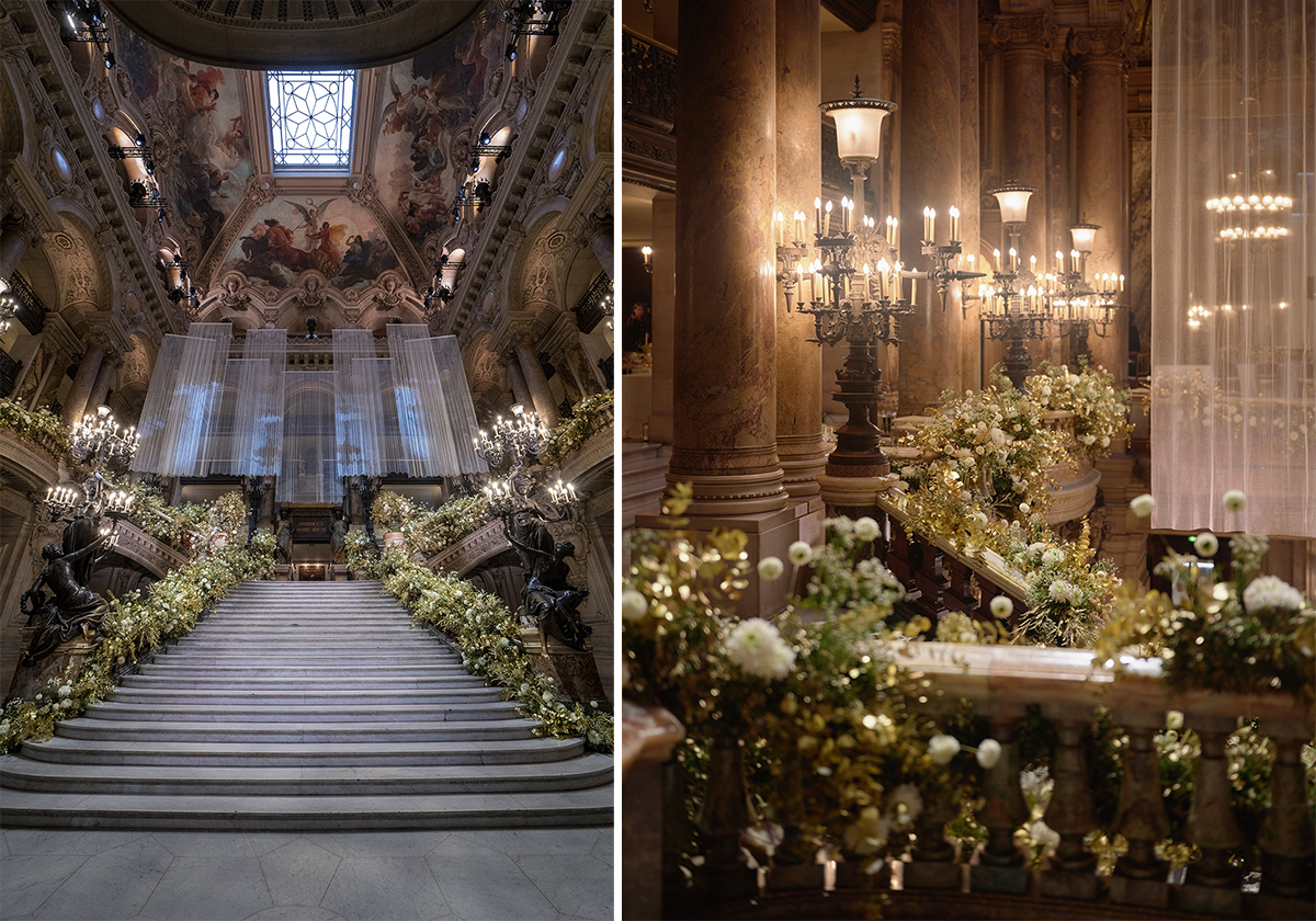 白とゴールドの花で品格高い装飾を施されたガルニエ宮。photograhy: Virgile Guinard