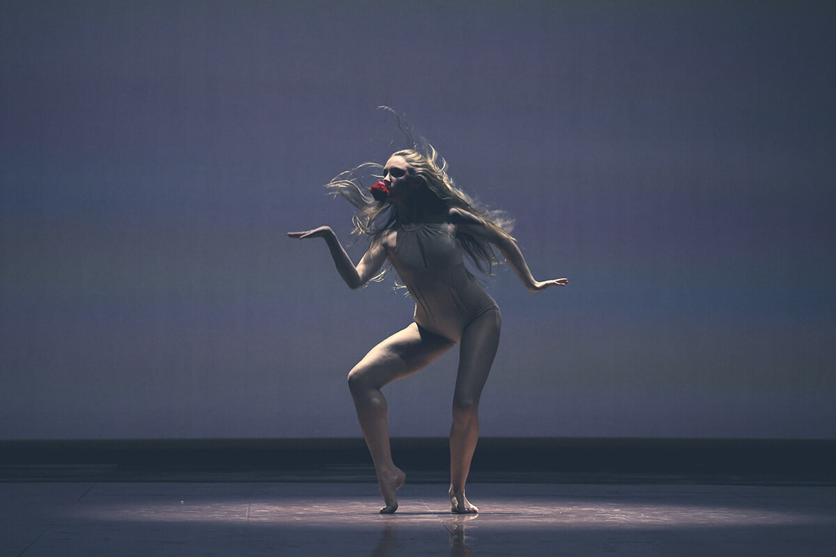 『Requiem for a rose』より。心臓の鼓動を表す音とともに、赤いバラを口にくわえた素足の女性ダンサーがコンテンポラリーの振り付けで踊ることから始まる作品。彼女は愛と純粋な心のヴィーナスを象徴しているそうだ。©Maria-Helena Buckley/ OnP