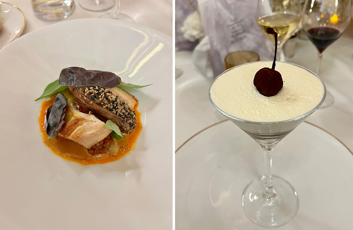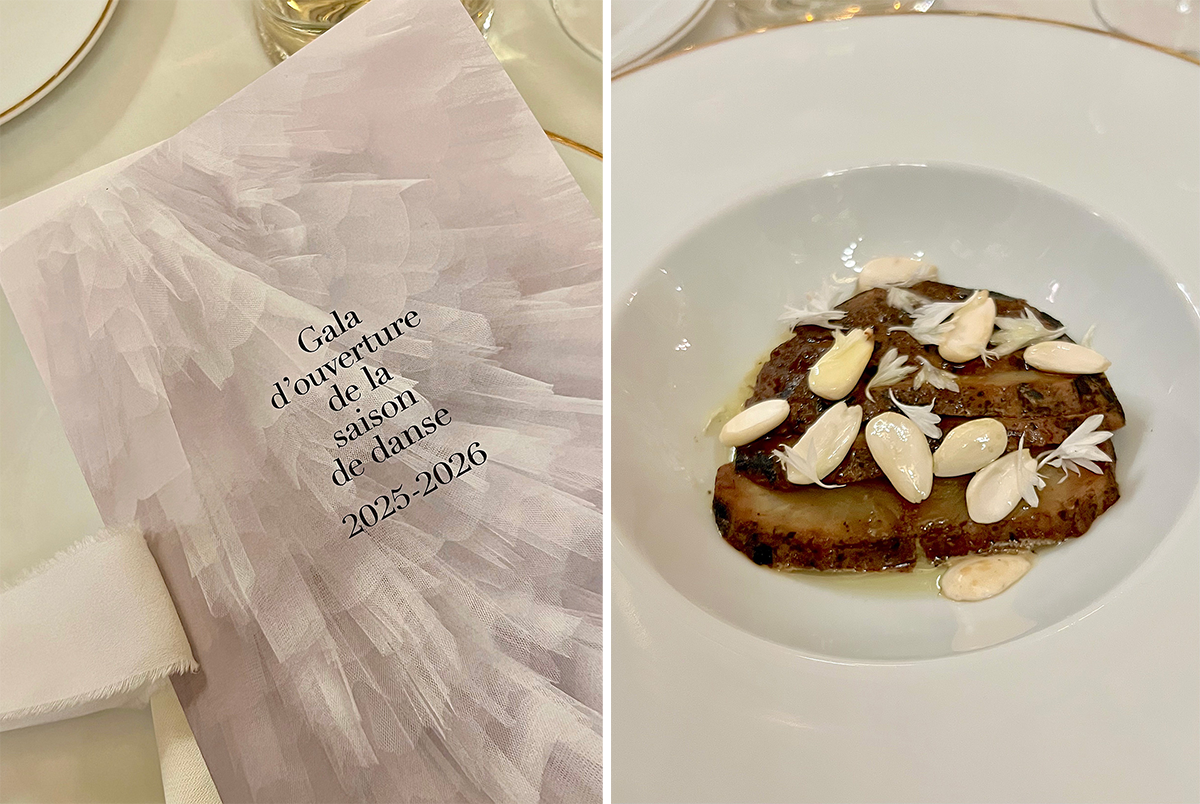 公演の後は、ガルニエ宮のグラン・フォワイエとその周囲のスペースにテーブルを並べて750名以上が参加のスーペ。最近は1人のシェフではなく前菜、メイン、デザートについてシェフを変えている。選ばれるシェフはフランス・ガストロノミーの新星たちで、今回、前菜はクリエイティビティと味の良さが評判で予約の取れないレストランDandelionのシェフ、アントワンヌ・ヴィラールによるアーティチョークとストラチャテラ、それにインド系スパイスのヴァドゥーヴァンを効かせて野菜の味をより深いものにし、白いアーモンドが視覚のコントラストを添えて軽さを表現した一品。メインはCheval d’Orのハンス・グエコによるランド地方のヴォライユに野菜のファルシーで、胡麻&パプリカソースがコスモポリタンな味を生み出していた。そしてデザートはゼリカ・ディンガが率いるクリエイティブ・スタジオCaro Diarioによる軽やかなチョコレート・リエジョワ。日頃ポップアップでしか味わえないゼリカのアイスクリームが洗練された味わいとビジュアルで、食卓に輝きをもたらして食事を締めくくった。伝統と革新のパリ・オペラ座バレエ団にふさわしい内容のこれら食事に合わせられたのは赤ワインがシャネルのシャトーからCroix Canon 2018、そしてシャンパンはTaittinger Comptes de Champagnes Blanc de Blancs Grands Crus 2014という厳選の飲み物だった。