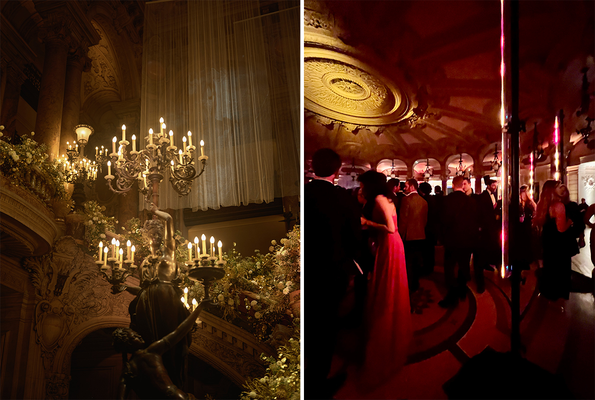左:照明と装飾でガルニエ宮が表情を変えるガラの宵。 右:地下のアフターパーティ。photography: 左 Virgile Guinard、右 Mariko Omura