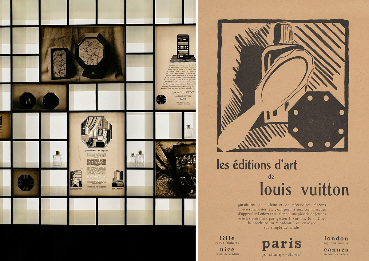 左:「From Drawing to Advertising : the process of creativity(ドローイングから広告へ:創造のプロセス)」より。photography: Mariko Omura 右:1925年の博覧会のフランス委員会におけるエディション・ダール・ルイ・ヴィトンの広告。©Louis Vuitton Malletier