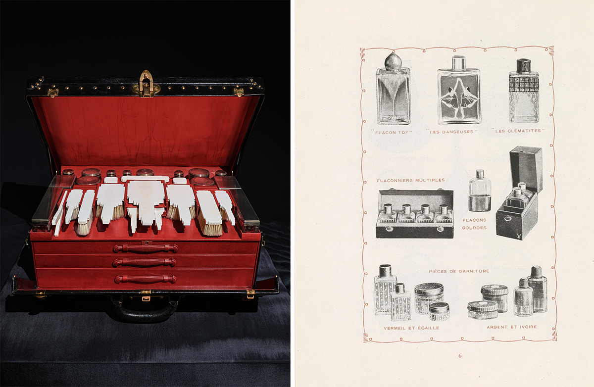 左:象牙素材を用いたブラシとシルバー×クリスタルのボトルなど26点を収めた「ミラノ」。ブラシ類は毛先がどこにも触れないよう緻密に設計されている。©Louis Vuitton Malletier 右:1924年のルイ・ヴィトンのカタログより。©Louis Vuitton Malletier