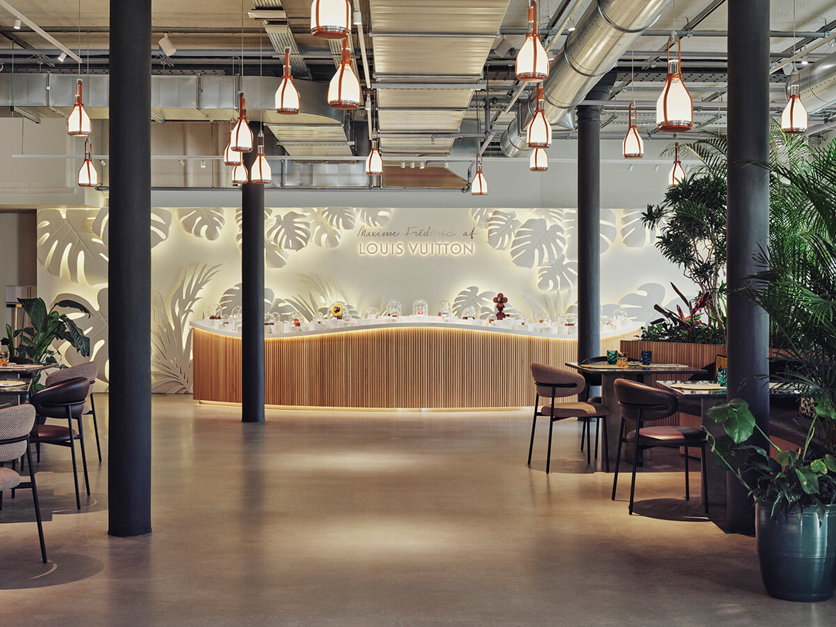 展覧会の鑑賞後は上のフロアのル・カフェ マキシム・フレデリック アット ルイ・ヴィトンへ。パティスリーだけでなく軽食、カクテルなどが揃えられていて、展覧会の余韻にゆったりと浸りながら美食の旅時間が過ごせる。ギフトショップも併設されているので、チョコレートやコレクターズアイテムの買い物を楽しんでは?