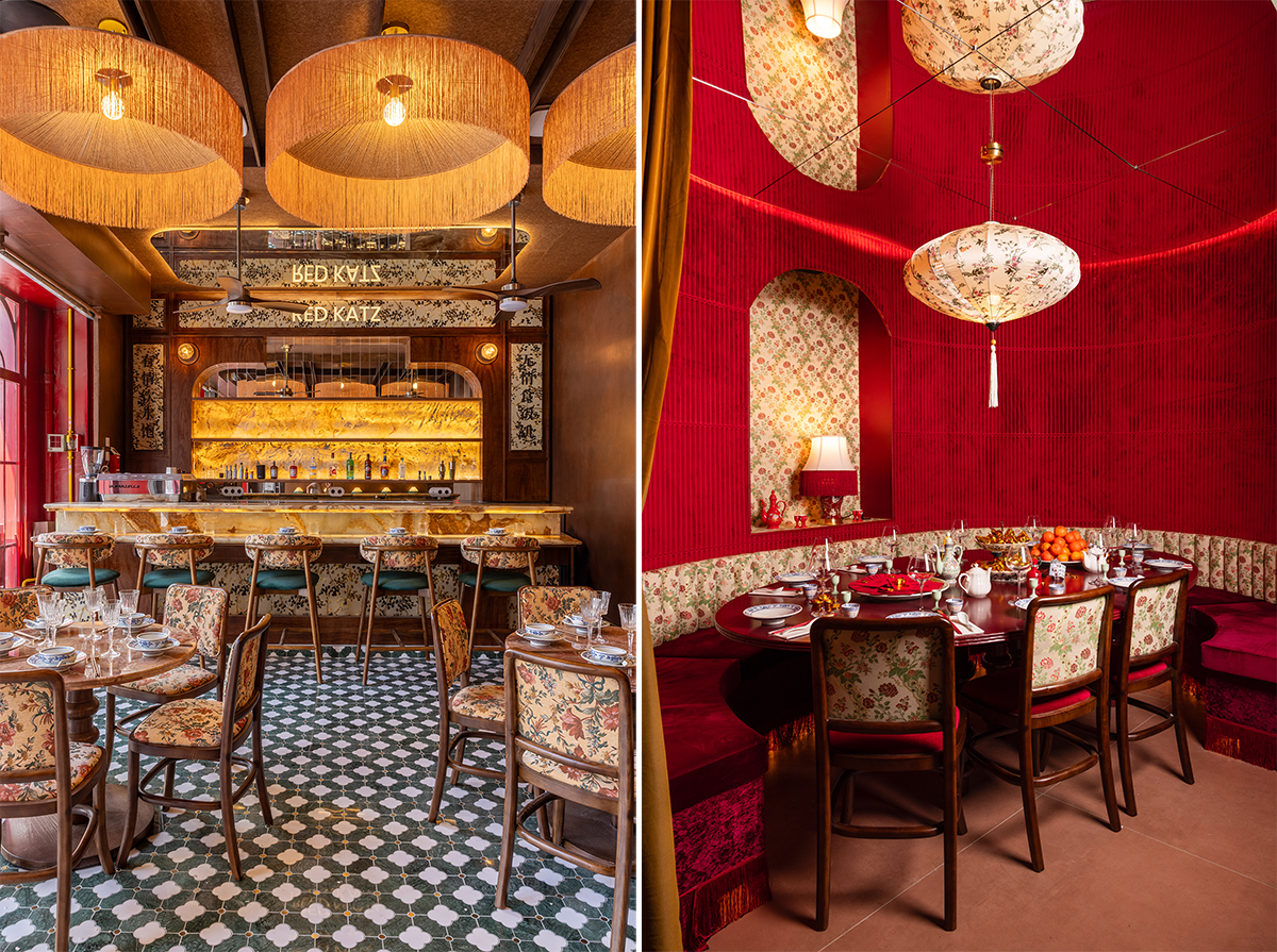 赤い外観の奥に広がるのは300平米のレストランで、映画の1シーンに飛び込んだようなレトロ・シックな内装が待っている。レッド・カッツを開いたのはクレール・ヒュアン、エレーヌ・ディング、エレーヌ・ヒュアンの30歳前後の若い女性たち。3名はフランスと中国のハーフで親は中華料理店の経営者いう共通項を持つ。2つの文化と二国の料理に育まれた彼女たちが、同世代の若いパリっ子たち向の中華料理の発信地を開いたのだ。メニューに並ぶのは現代的タッチが添えられた中国の様々な地方の料理、伝統料理である。ディムサム、炒め物、ローストの3部門でそれぞれのシェフが担当。テーブルに登場する料理は、盛り付けも美しい。