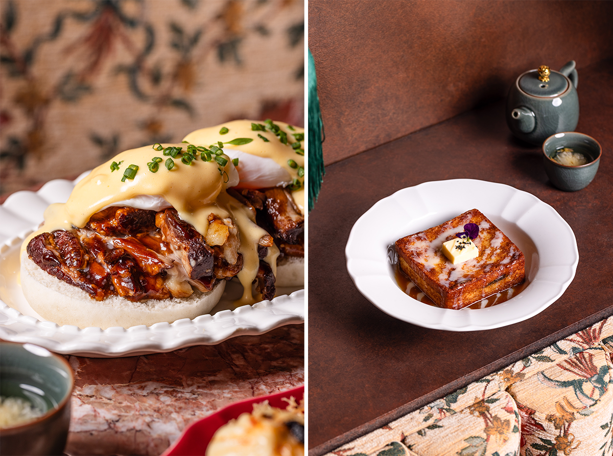 左:饅頭素材の柔らかなバンズに、24時間煮込んだ豚肉とウフ・ポッシェを乗せてクリームで包んだDong Po Benedicte。 右:デザートのフレンチ・ホンコン・トースト。フレンチ・トーストのレッド・カッツ・バージョンだ。photography: The Travel Buds