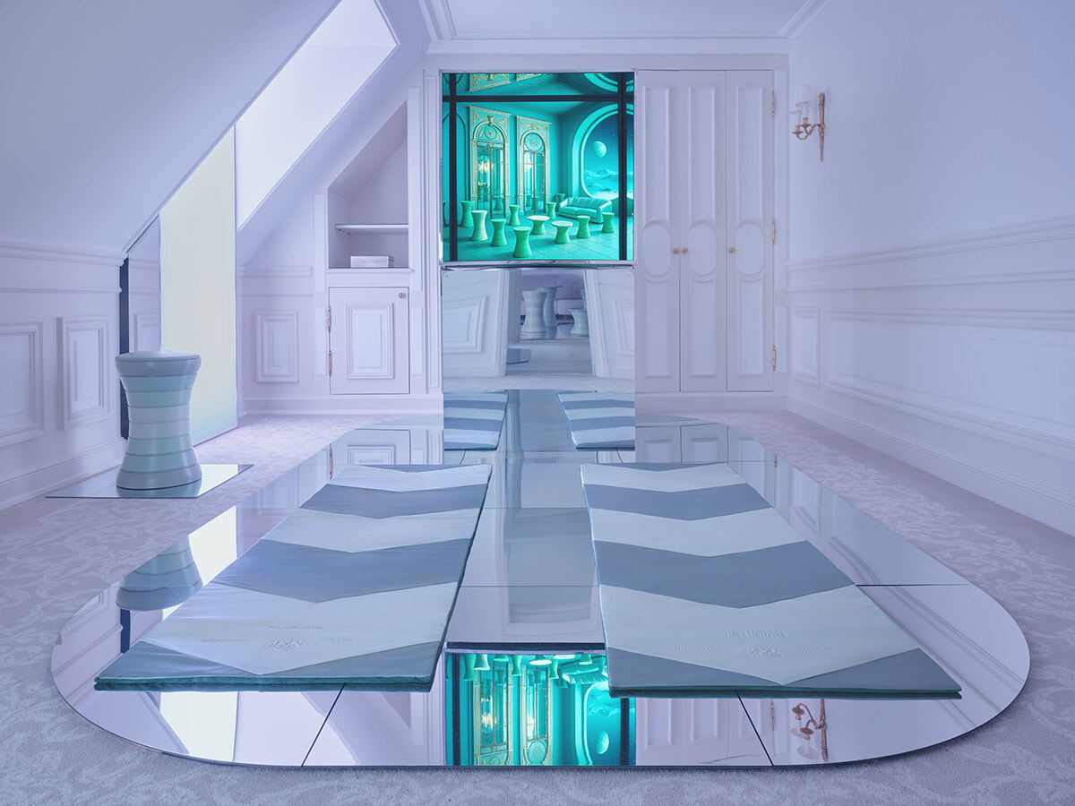 感覚に訴える旅を提案する1室だけのユニークな内装はまるでアート作品のよう。パリをベースにするファッションコンサルタント&スタイリストのジェラルディンヌ・ブーブリとブエノス・アイレスにIsskaという建築スタジオを持つデザイナーのジェシカ・ソルニキが設立したThings Fromの仕事である。1835という数字は部屋番号ではなく、ホテルの開業年。というのもこのスイートルームのユニークな内装は、歴史的遺産と未来予測のコントラストがテーマゆえ。高級な素材、職人技、デジタルアート、IAが絡まりあう空間で、そこに並ぶ家具はアルゼンチンのISSKAの工房で製作されたものだ。ベッドルームは周囲を映しこむ床の鏡が方向感覚を失わせ、空間全体がグリーン、ブルーなど色彩を変えてゆき、瞑想的空間のようだ。フィットネスルームもしかり。ここで画面に合わせて革のマットに体を委ねてヨガやピラティスを行えば、精神集中によって感覚の旅により深く没入できそうだ。