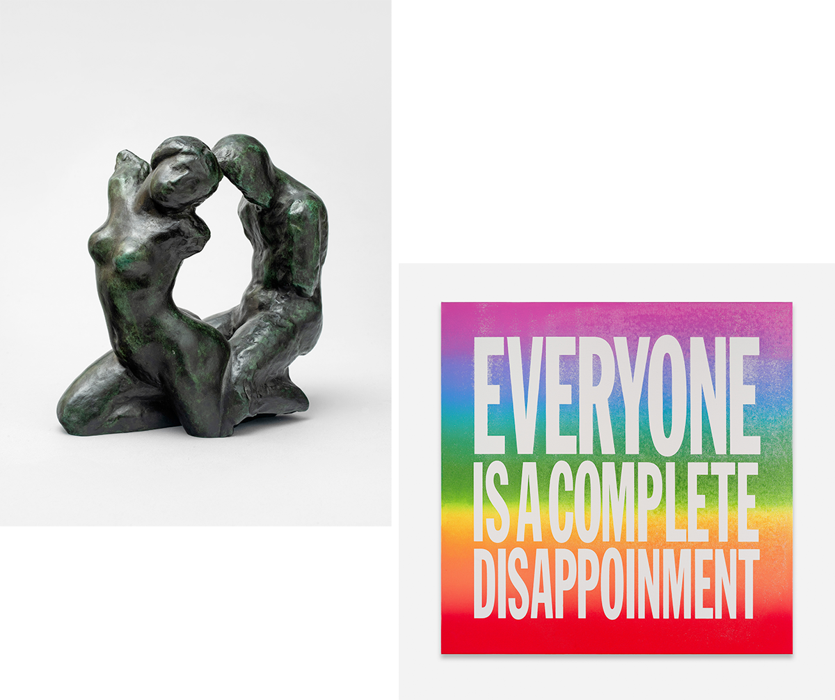 左:アリスティド・マイヨール『Le Couple ou L’homme et la femme』(1896年)Courtesy Galerie Dina Vierny ©Aristide Maillol, Le Couple or L’homme et la femme, 1896 右:アンディ・ウォーホルの映画『Sleep』で眠り続ける姿を撮影されたジョン・ジョルノ。その彼が愛の失望を語る作品『Everyone is a complete disappointment』(2018年)©Giorno Poetry Systems – Courtesy of Giorno Poetry Systems and Almine Rech
