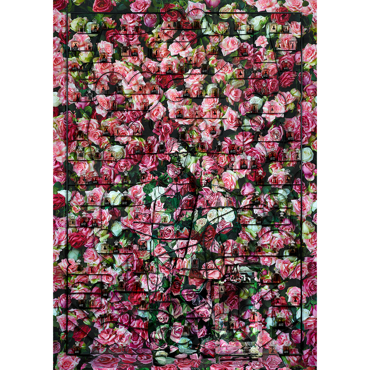 リウ・ボーリン作『Hiding in the City -Paris, Love』(2014年)。バラの花と香水ラ プティット ローブ ノワールのボトルが埋め尽くす写真。作家はここに初めて自身の顔も取り入れている。©Liu Bolin, Courtesy Liu Bolin /Galerie Paris-Beijing/ Collection-Guerlain