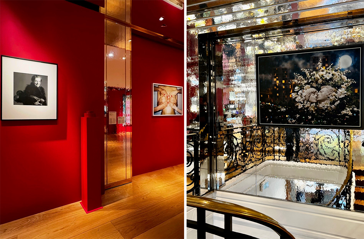 この展覧会はゲランがパートナーを務めるアート・バーゼル・パリの一環で、ブティック内で開催される17回目となるアート展なのだが今回とてもユニークでゴージャスな試みがなされたのだ。展示されているいくつかの作品について、メゾンの専属調香師&フレグランス クリエイション ディレクターのデルフィーヌ・ジェルクがアーティストとの対話から共通の感動が得られる香りをクリエイト。該当作品の脇に赤いボックスが置かれ、蓋を開けると香りを染み込ませたハートが! この香りを体験することで、来場者たちはアーティストの愛の表現により深く浸ることができるのだ。