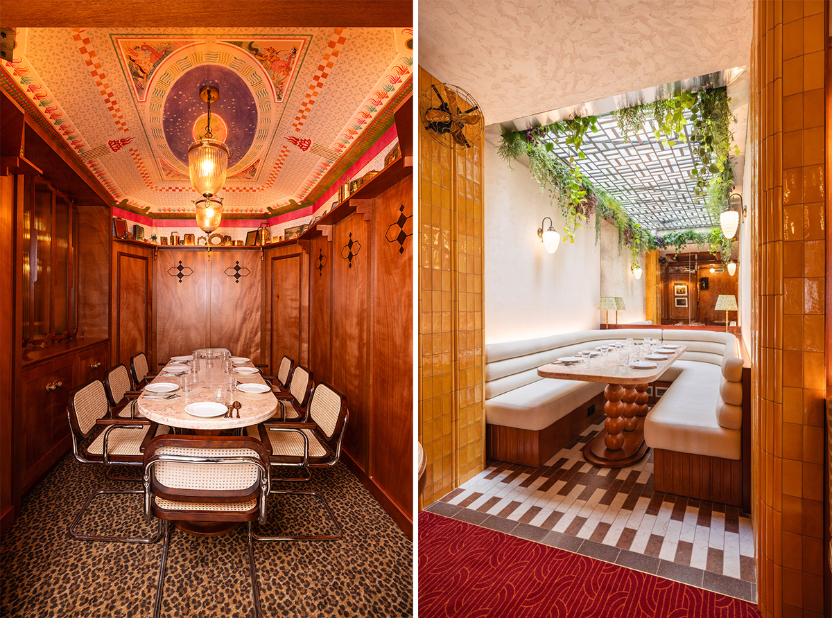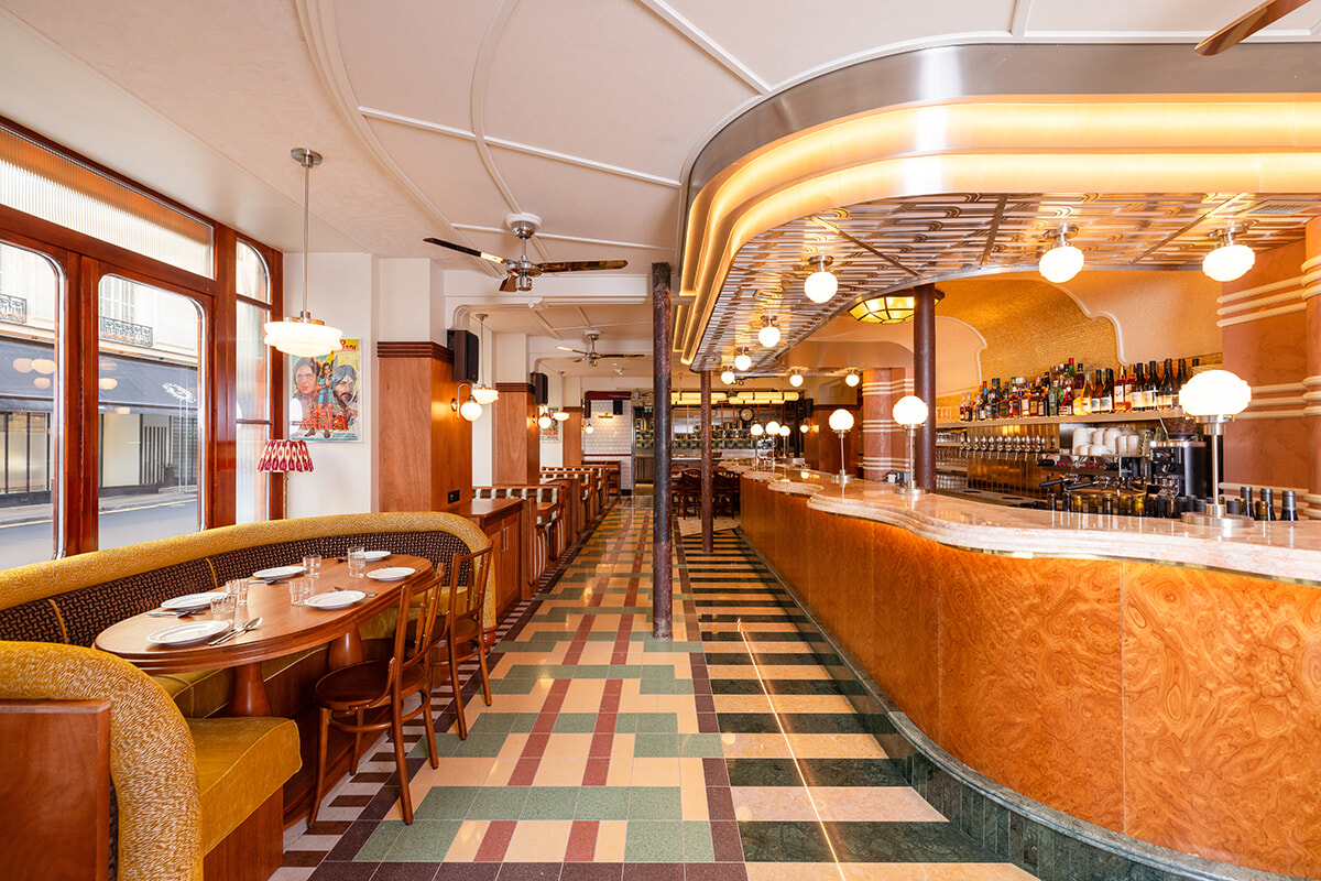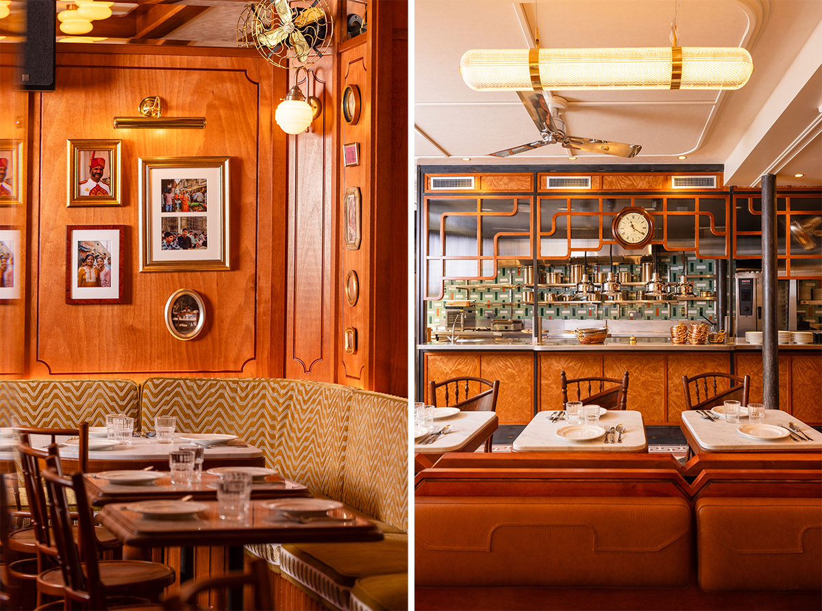 ムンバイといったら2018年にそのアール・デコ遺産群が世界遺産に登録されているように、アール・デコ建築の建物がマイアミ並みに多数残されているのだ。1925年開催のアール・デコ展100年を祝う今年、パリ市内のアール・デコ建築も再び注目を集めている。ムンバイ・カフェがオープンしたトレヴィーズ通り6番地は、ミュージックホールのFolies Bergères、そして映画館のLe Grand Rexというパリの代表的なアール・デコの建物の近く。そんな偶然の歴史的つながりから、Dorénavant Studioによるムンバイ・カフェの内装はボンベイのイラニ・カフェ経由のアール・デコというイメージだ。レストラン内に足を踏み入れるや、圧倒されるのは丸い電球を天井に並べた大理石の長いバーカウンター。映画『ダージリン急行』の世界に入ったような気になる。床はボンベイにおけるアール・デコ素材のひとつである花崗岩がムンバイから取り寄せられて使われている。店内にはイラニ・カフェ的に丸みのあるテーブルとビストロチェアの組み合わせの食事席もあれば、ボックス席も。
