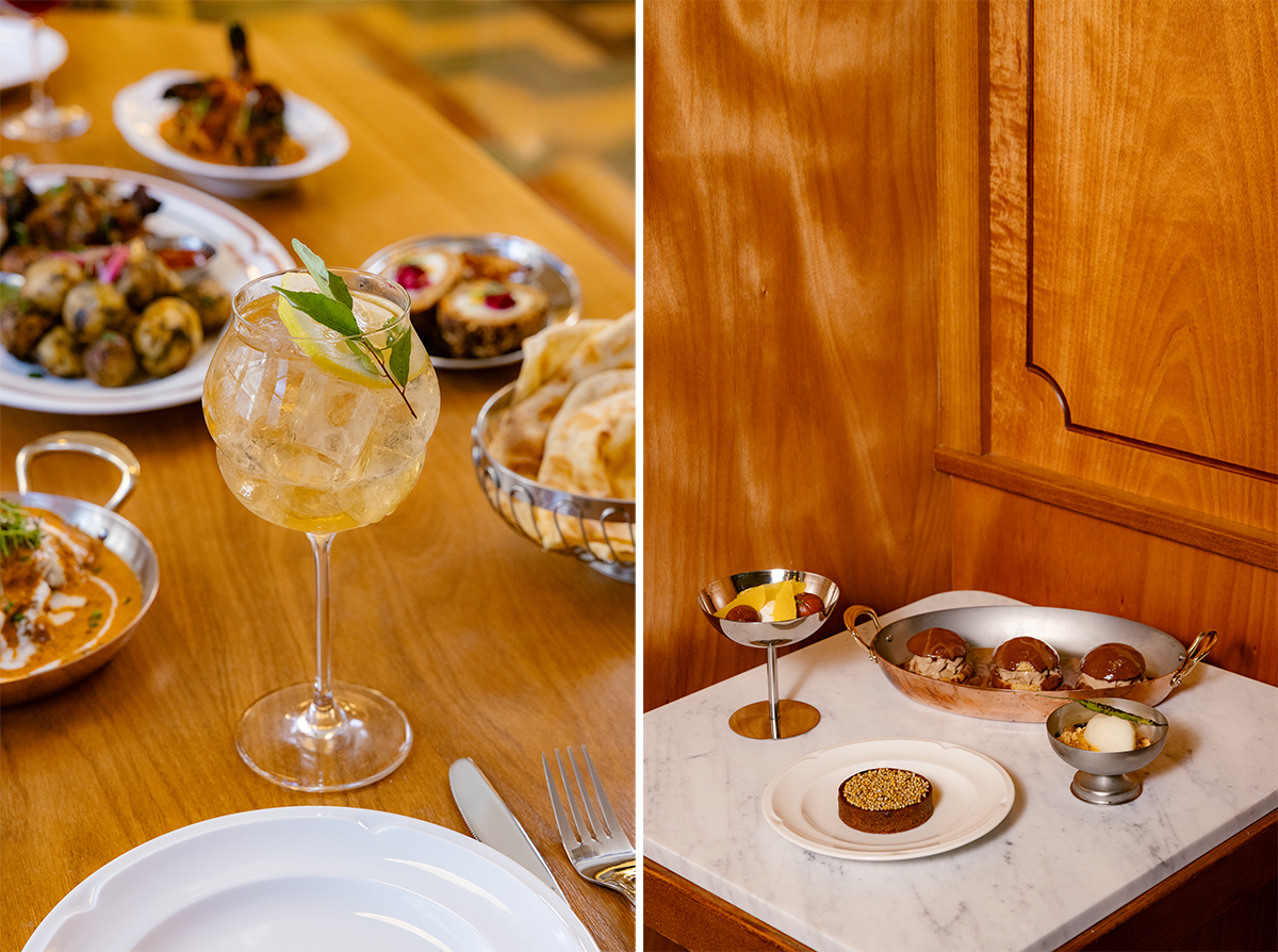 左:インド料理もカクテルとともに。 右:チャイのプロフィトロールなど、興味をそそる印仏デザートの数々。©The Travel Buds