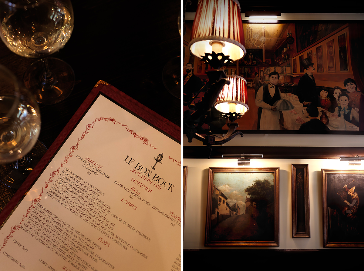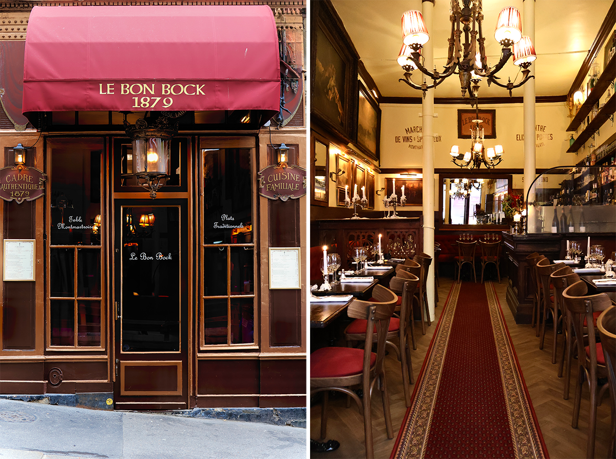 このレストランを体験せずにパリ旅行を終えてしまっては惜しい。雰囲気、料理、サービスよしと三拍子揃ったLe Bon Bock(ル・ボン・ボック)を紹介しよう。小さな通りにその小さなビストロがオープンしたのは、1879年。その20年前に12区あったパリが20区まで広がり、大勢のアーティストたちが家賃の高い中心部からまだ開発されていなかったモンマルトルに引っ越してきていた。サクレ・クール寺院の工事が少し前に始まったという頃、モネ、ロートレック、マネ、ゴッホ、ピカソ、ドガ……ベル・エポックの時代、界隈に住むアーティストたちが通ったレストランが、このル・ボン・ボックである。店名についているボックとは1/8リットルのビール用のコップのことだ。