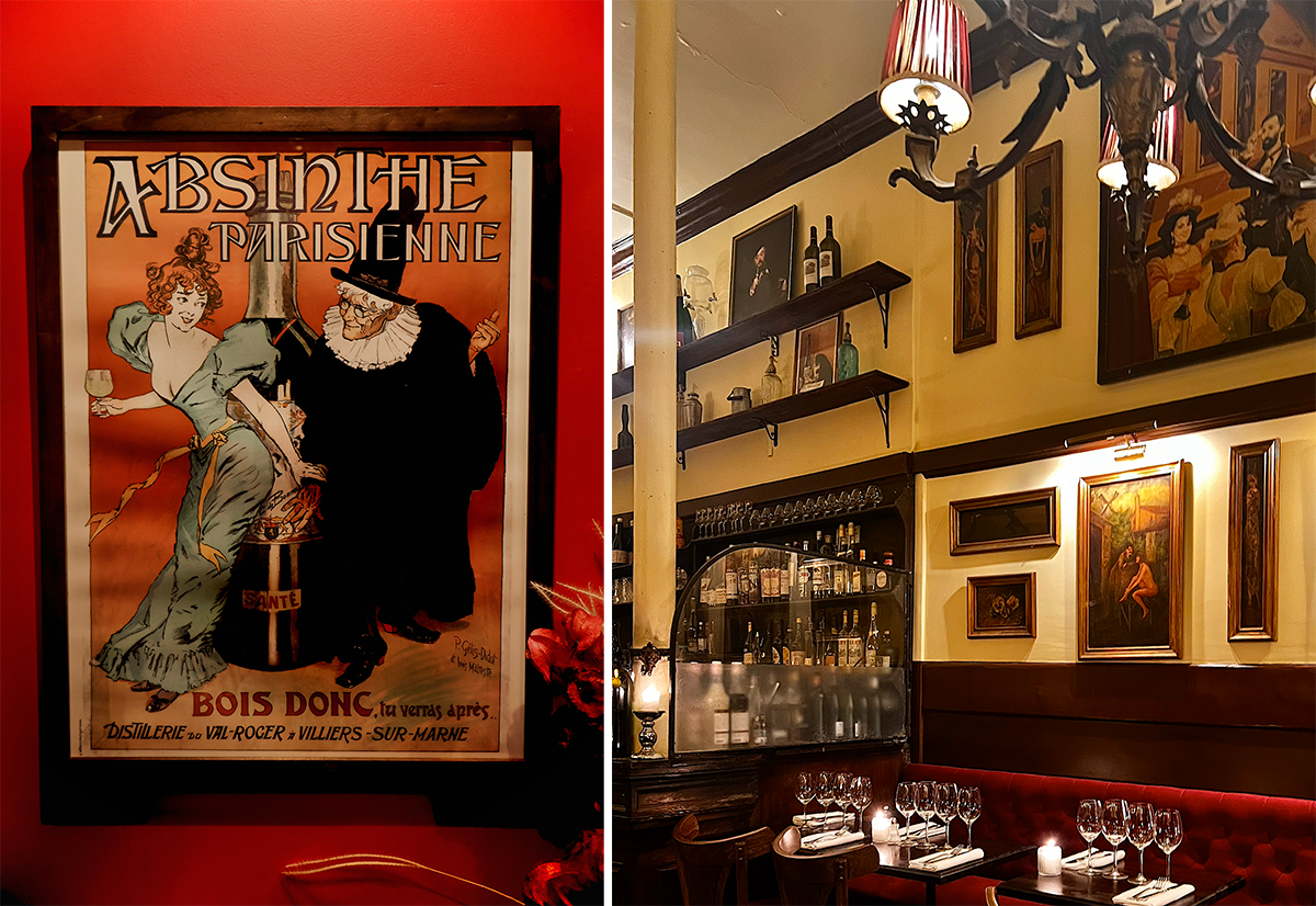 壁には絵画が多数壁に掛けられている。中にはニガヨモギを材料にしたリキュールのアブサンの昔の広告が。アルコール度が高く、安く酔えるとあって19世紀末の画家たちに愛されたが中毒性が強く精神を蝕まれる人も多く出たことから、1915年法によって製造が禁止された(2015年解禁)。 photography: 左 @sam.moreel、右 Mariko Omura