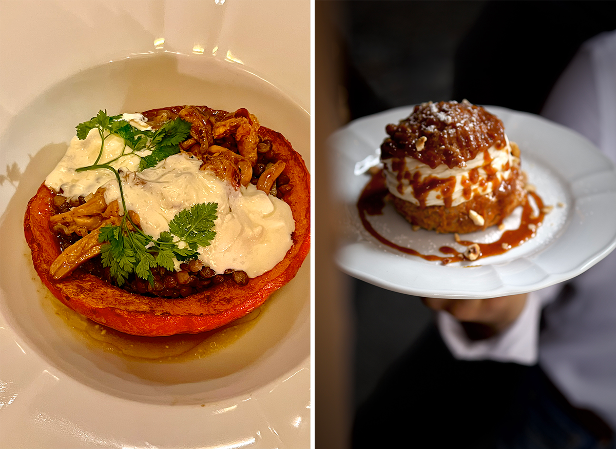 左:季節の料理は、きのこ、レンズ豆、トリュフクリームを詰めたかぼちゃ。16.90ユーロ。 右:ボリュームたっぷりのデザートで締めくくる、満足の食事。9.90ユーロ〜。photography: 左 Mariko Omura、右 @sam.moreel