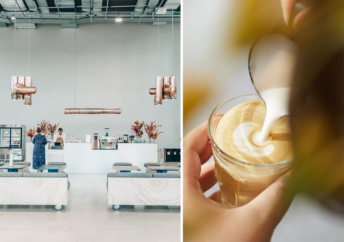 広いエントランスホールに設けられたカフェ。営業はカフェが11時〜17時(水〜日)、ランチが12時〜15時(月〜金)。photography:(左)le19M×Gael Turpo、(右)le19M×ThimotheeChambovet