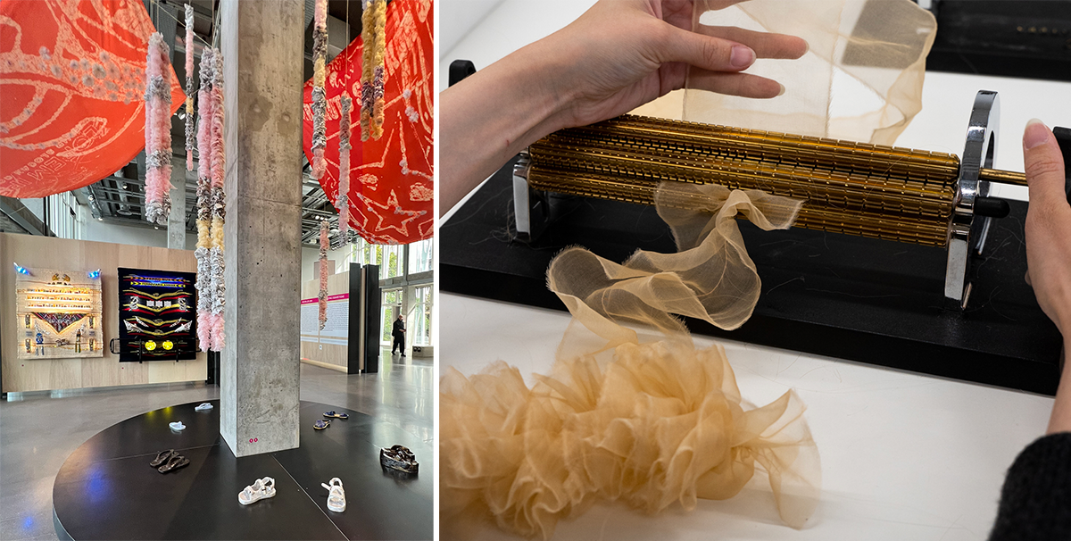 ギャラリーでは12月14日まで『Trouver son Monde(自分の世界を見つける)』展が開催されている。展示作品を鑑賞することで、現代のクリエイションとモードやインテリアに応用されたメティエダールのサヴォワールフェールとの間の対話を発見する展覧会だ。7種のコラボレーションが行われ、テーマは「ジェスチャーを永続させる」「つながりを物語る」「場所を探索する」「自分のものを求める」の4章に分かれている。メゾンダールからの参加は刺繍のアトリエ・モンテックスとルサージュ、そしてソフトで軽い布地を専門とするパロマ、羽根細工のルマリエ、そしてルマリエ傘下のプリーツのアトリエのロニオン。