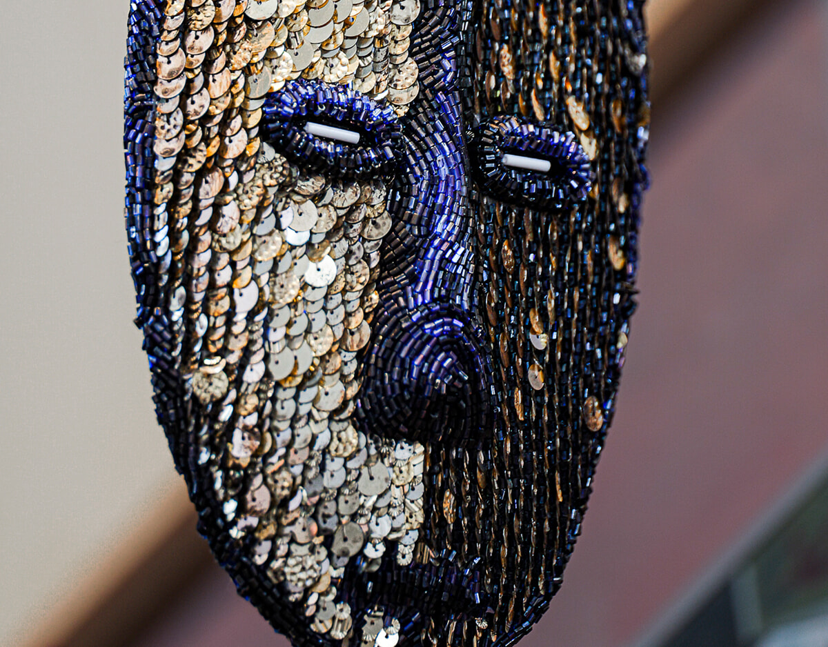 Rakajoo×Maison Lesageの『Un Instant』。ウォルフ語で顔・頭を意味するRakajooをアーティスト名に持つBaye-Dam Cisséとルサージュのコラボレーションは裏表で2つの表情という二面性の仮面。photography: ©le19M×Ismaël Bazri