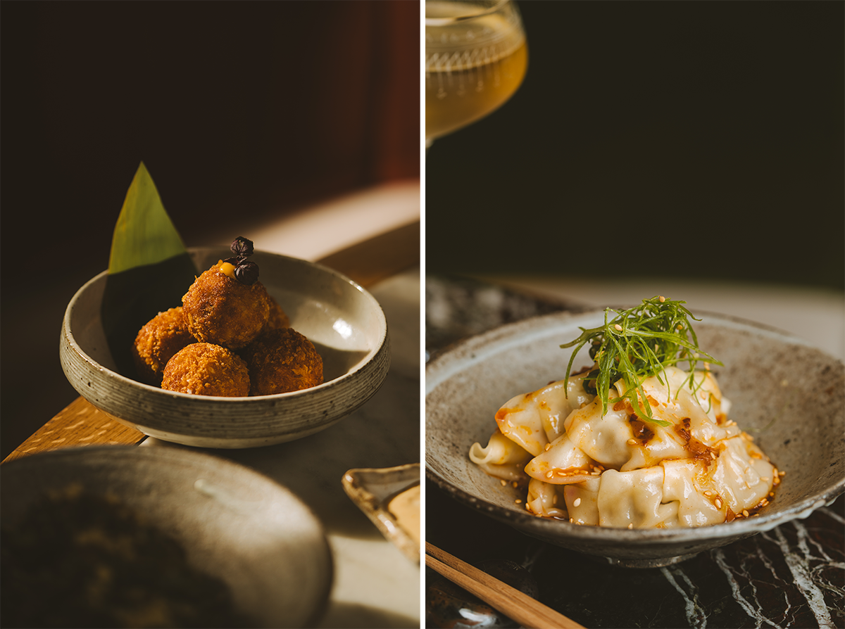 アラカルトのスナックメニューは、魚とサツマイモのコロッケや餃子など。