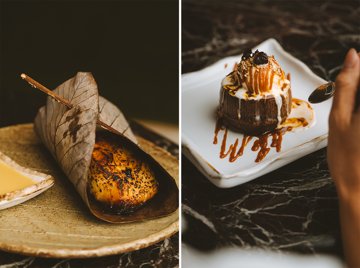 左:シェア料理から、ブラックコッドの味噌焼き。 右:デザート。