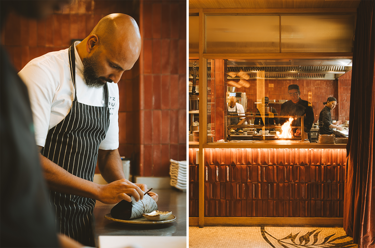 左:シェフのルーディ・ペターソン。 右:オープンキッチンの中、炭火焼の火が上がる。
