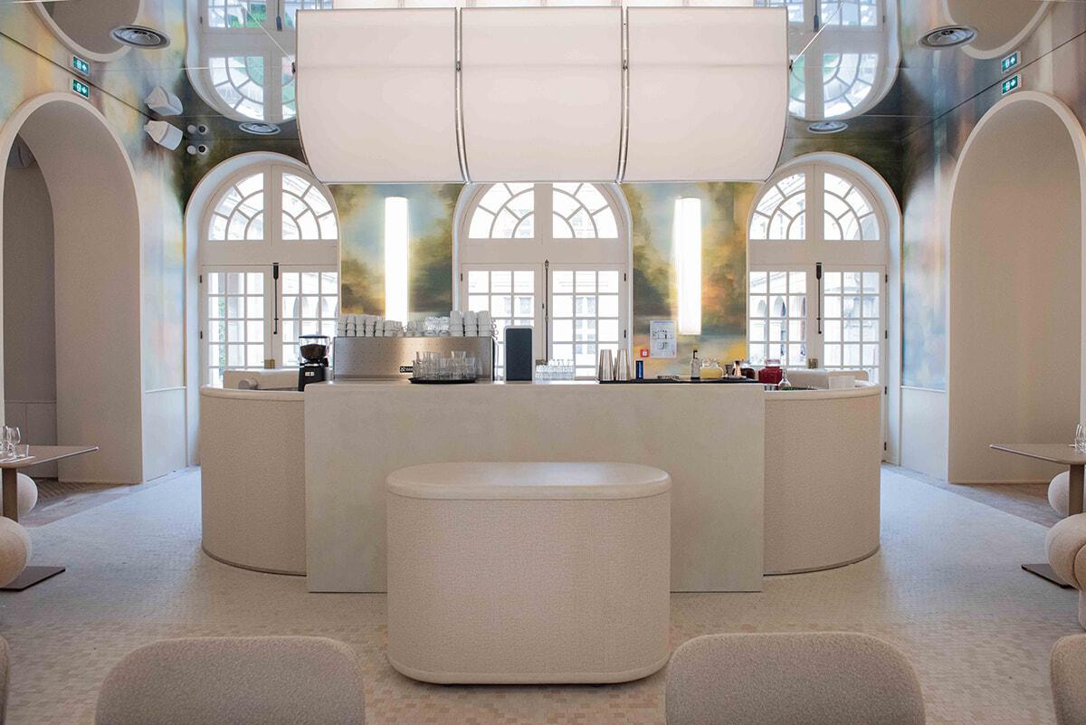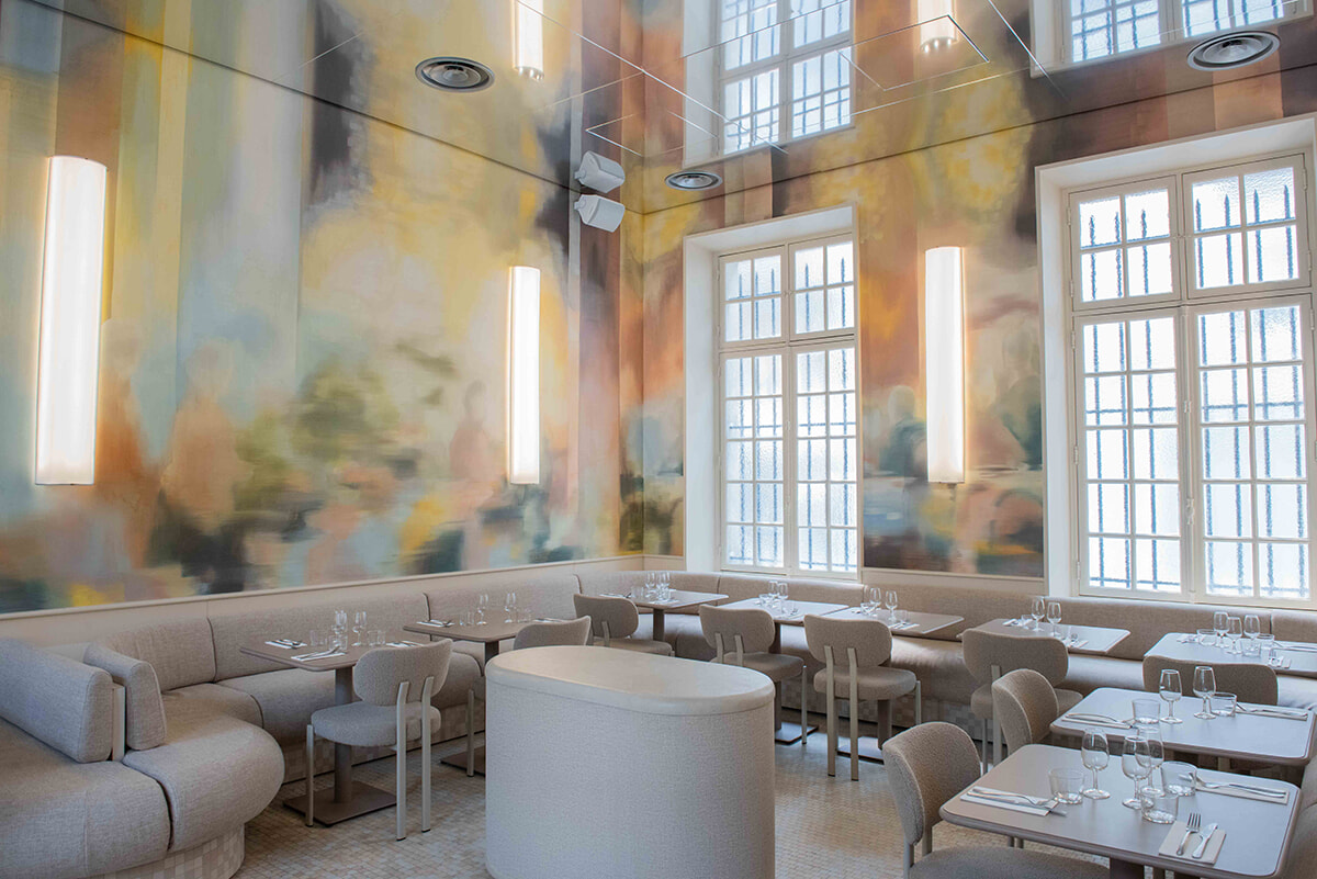 ジョリは美術館にありがちな軽食オンリーのカフェとは一線を画し、料理も本格的ならインテリアもとてもシックだ。内装を任されたのはAMVスタジオ。鏡張りの天井と淡い色のフレスコが作り上げる空間に、レストランに入るや包み込まれる感覚が快適だ。