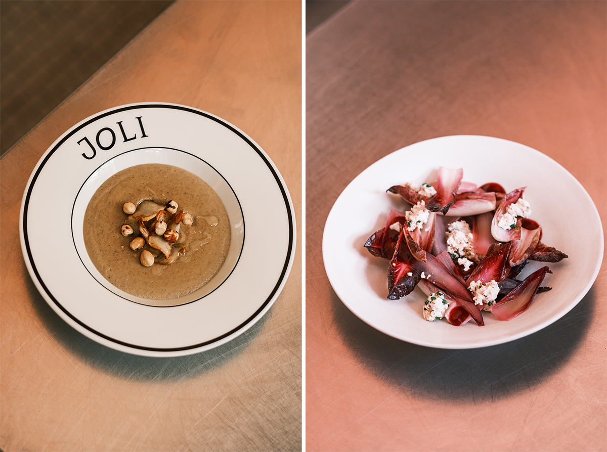 前菜より。トピナンブール(菊芋)のノヴルーテ(左)、アンディーブとヤギのチーズのサラダ。