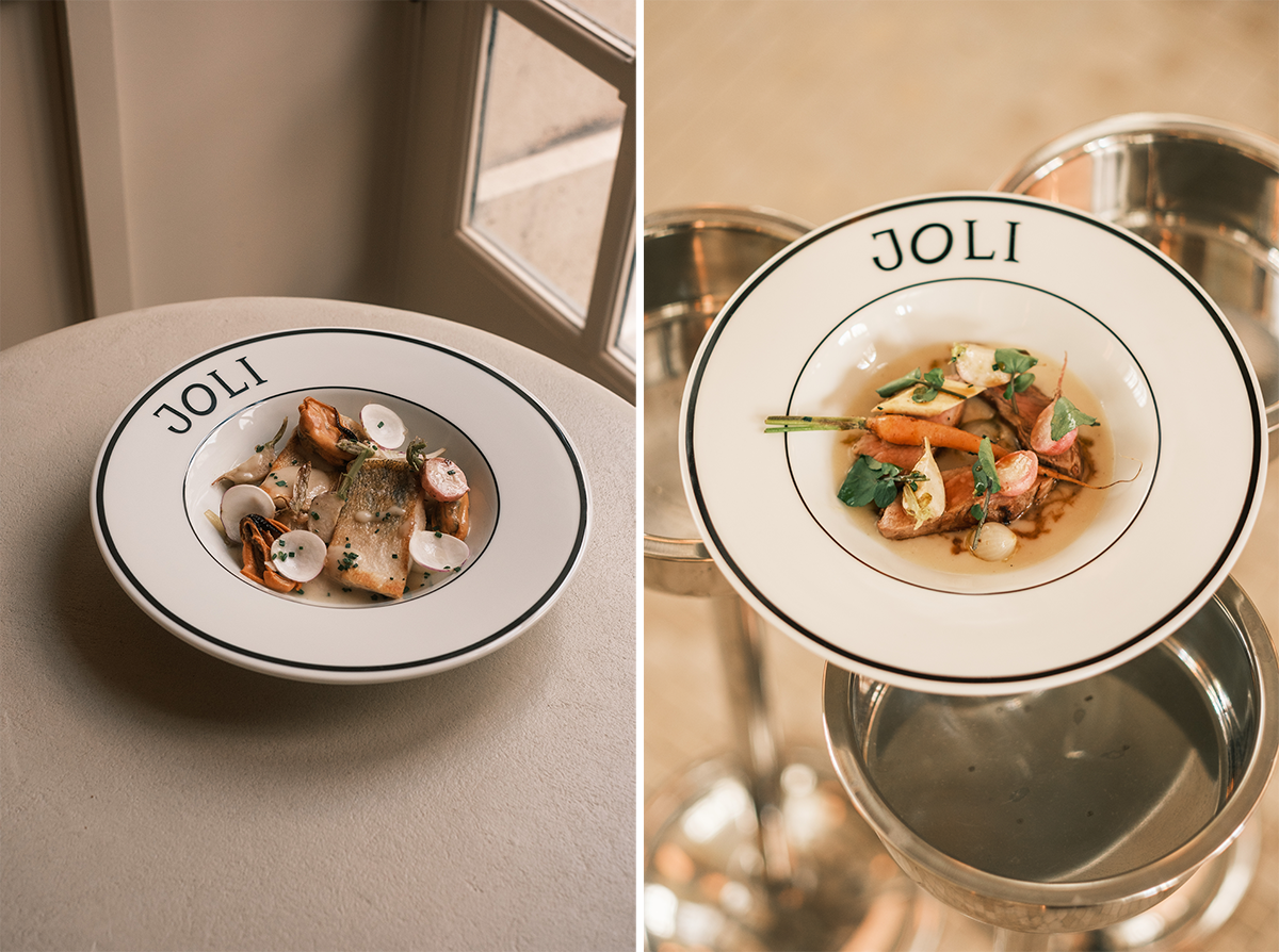 シェフにはガストロノミー・レストランのル・ムーリスやルカ・カルトンでの経験を持ち、またPlume、Duneのオーナーシェフでもあったユセフ・ガストリが新たに迎えられた。料理はおしゃれなビストロと食いしん坊のブラッスリーとの融合というイメージで、現代的解釈によるフレンチ・クラシックがメニューに並ぶ。シェフの素材の厳選ぶりが味に表れる季節の味を楽しもう。デザート担当はセバスチャン・ゴダールのもとでパティスリー修行をスタートしたというパロマ・ラゲットだ。前菜のサラダに梅干しが使われていたり、デザートのチョコレートムースに赤味噌……と、ジョリでも日本食材がクラシックな味にひねりを与え、また飲み物リストにはカクテルあり、モクテルあり……古い建物内にいながら、いまのパリらしさを満喫できるレストランである。ランチタイム・メニューは前菜+メインかメイン+デザートで29ユーロ、前菜+メイン+デザートで39ユーロ。
