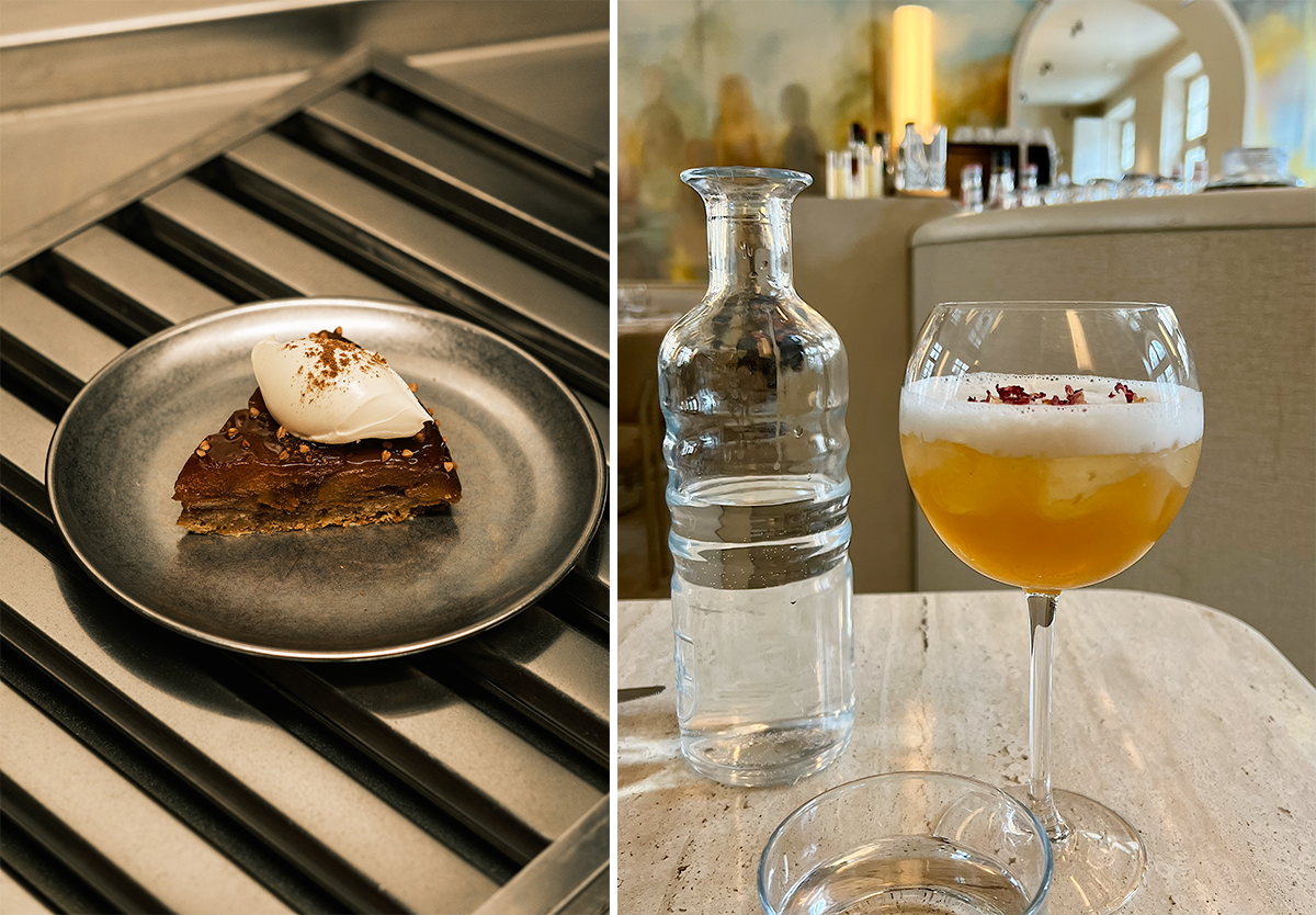 左:クラシックなタルトタタンはチャイ風味スパイスを効かせて。 右:ミクソロジーのテオ・メバルキがクリエートするモクテルは、美術館の庭へのオマージュ。photography: Mariko Omura(右)