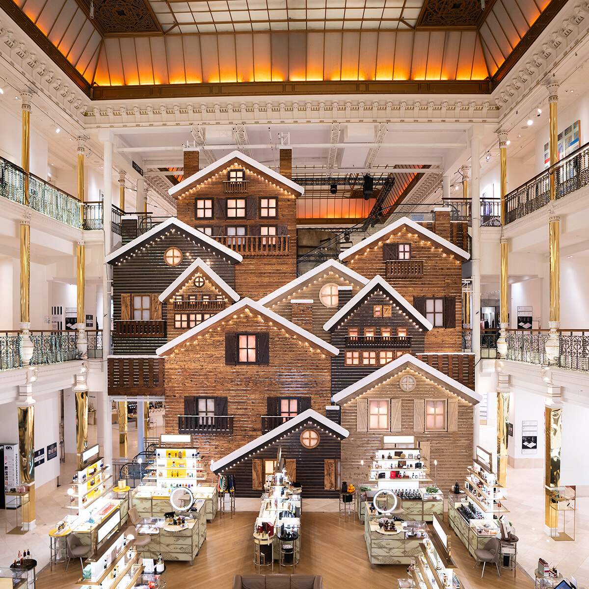 館内いたるところにクリスマス・シーズンならではのワクワク感と温かみに溢れ、それでいて”パリの左岸の”デパートらしくシックなノエルの装飾が施されている。吹き抜けの中央で目を奪うのは、屋根に雪を積もらせ、室内に明かりが灯された何軒もの山小屋が軒を連ねる、といったパリにいることを忘れさせる景色だ。寒い地方の小さな村を旅する気分にショッピング欲が刺激されてしまうのも、仕方ない!