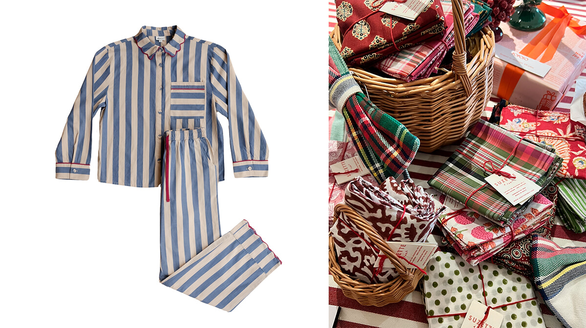 クリスマスプレゼントにも、自分用のパリ土産にも欲しくなる商品がマーケットに溢れている。左のパジャマ「サーカス」は82ユーロ。