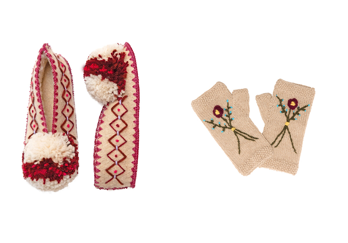 大勢が足を止めて、にっこりと手に取るフォークロアの室内ばきやミトン。