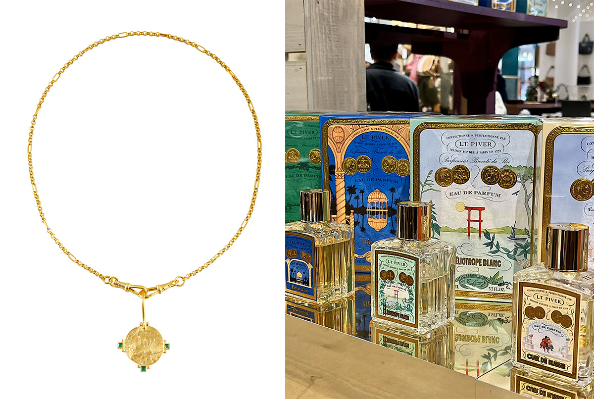 左:日頃ボン・マルシェでは扱わないブランドのジュエリーもマーケットに登場。 右:1774年創業のメゾンL.T. Piverは香水好きに喜ばれそう。