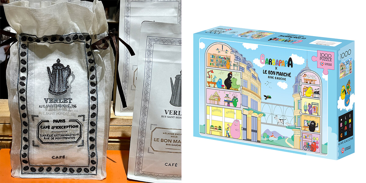 左:Café Verletのコーナーで一休み。カフェを味わい、おなじみのフルーツのコンフィとBrigitte Tanakaとのコラボレーションによるオーガンジーの袋を買う! 右:ボン・マルシェ×キャラクターBarbeapapaの1,000ピース・パズル。photography: Mariko Omura(左)
