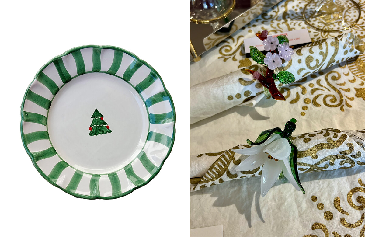 アール・ド・ターブルのファンへ。一枚あればクリスマス気分が味わえるPOPOLOのプレート(24ユーロ)や、ガラス製の繊細な花のナプキンリングを。photography: Mariko Omura(右)