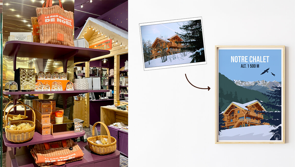 左:ノエルのパッケージングのデザインを生かしたトートバッグ、スノーボールなども販売。 右:パーソナライズが人気の時代。例えば一枚の思い出の写真を大きなポスター(50×70cm 139ユーロ〜)に。photography: Mariko Omura(左)