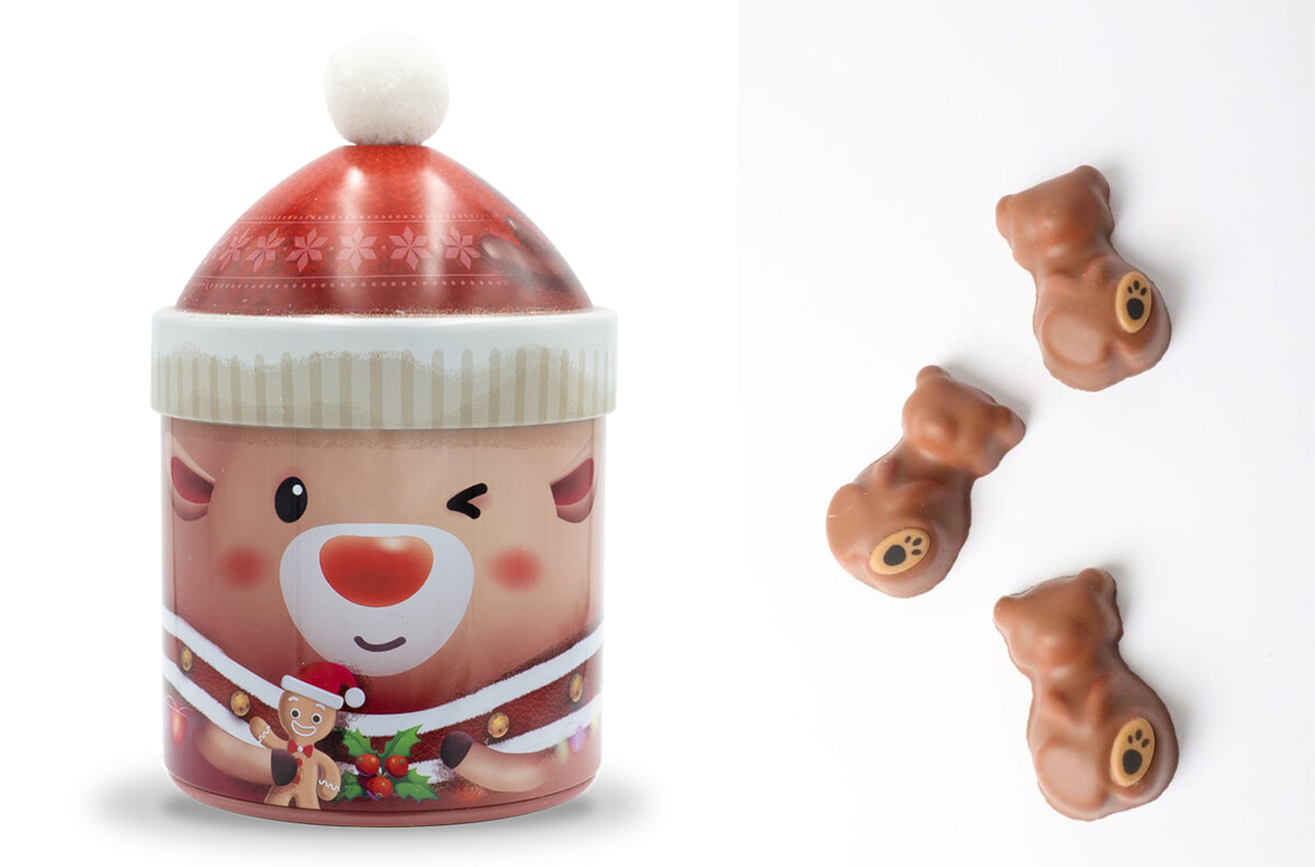 左:ミニクッキーを詰めたMaison DVのノエルボックス。 右:熊のマシュマロは数々あれど、ポウにノックアウトされるQuentin Baillyがチャーミングだ。