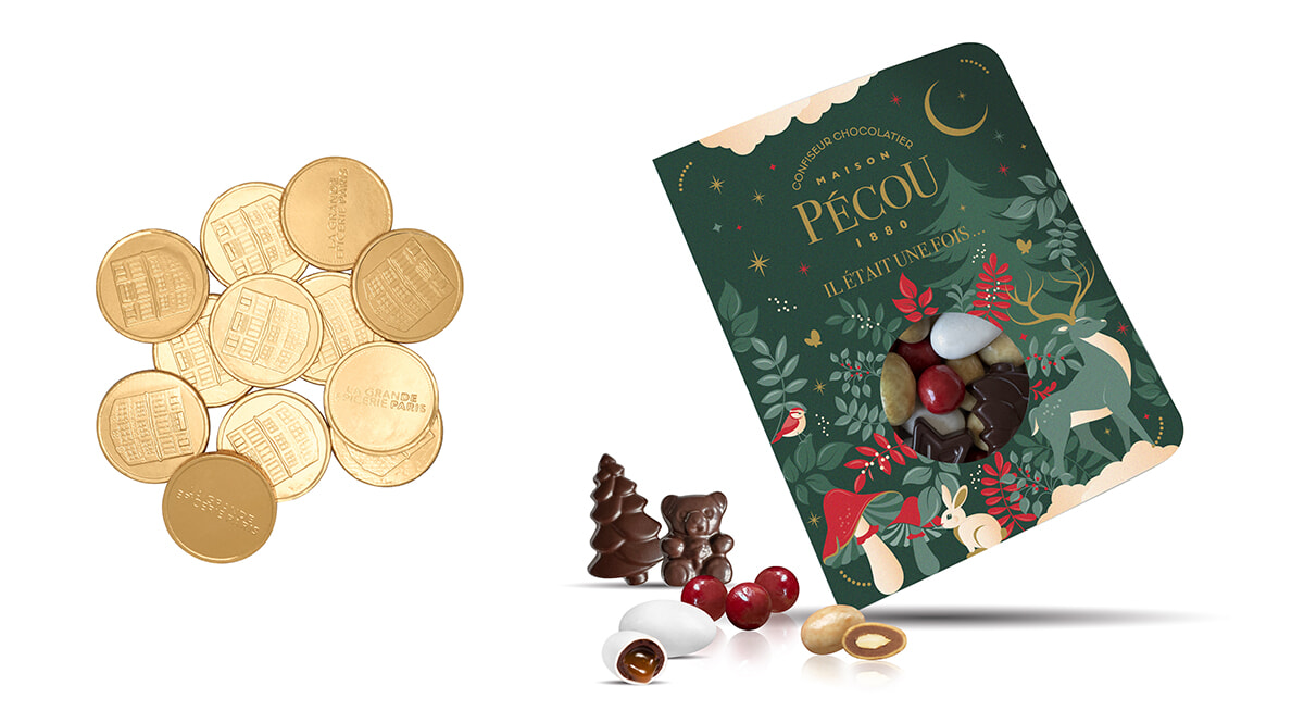 左:オリジナルのコインチョコレート、5.90ユーロ。 右:フランスの街モントーバンに1880年に生まれたショコラティエPécouを味えるチャンス。