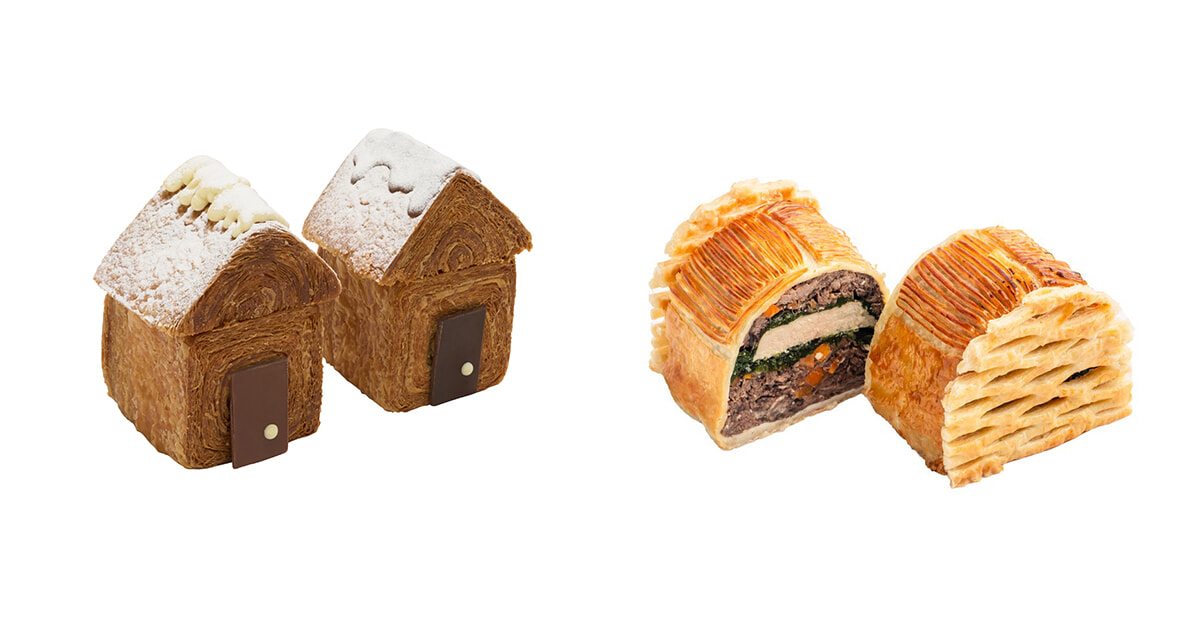 グランド・エピスリーのシェフたちが腕を振るったクリエイションから。左はパンの売り場から、中がプラリネの山小屋パン。1個 8.90ユーロ。右は最近多くのレストランでリバイバルしているPithivier(ピティヴィエ)。これはビーフ&フォアグラで6名用69ユーロ。