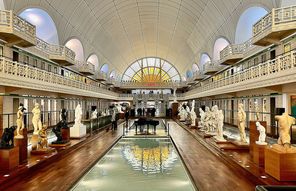 パリの北駅からTGVで約1時間、Lille Flandres駅へ。そこから電車でRoubaix駅、あるいは地下鉄2号線でGare Jean Lebas駅へ。徒歩7分で美術館のLa Piscine Roubaix(ラ・ピシーヌ・ルーベ)に到着する。ベルギーの国境の近くなので、パリっ子たちもこれは遠い場所にあると思ってる人もいるれど、実のところ観光者にも一般交通手段だけで行けてアクセスがしやすい。ラ・ピシーヌとはその名の通り、浴場も備えられたかつての市民プールだった建物。1927年から1932年にかけて建築された、見事なアール・デコ様式の建築物だ。1985年にクローズされ、2001年に美術館としてオープンした。プールがあった部分の室内建築が託されたのはオルセー美術館の1979年の改装を手がけたジャン=ポール・フィリポン。それゆえ、プールの左右に並ぶ彫像が並ぶ光景に、ふとオルセー美術館を思ってしまうのも不思議ではないのだ。