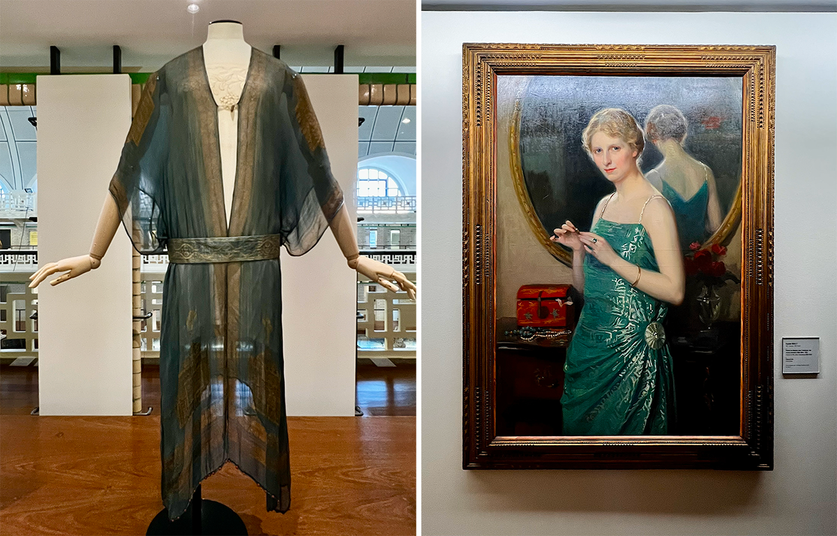 左:マリアノ・フォルチュニーによるドレッシングガウン。1920年。 右:アール・デコ期の女性たちの装いが描かれた絵画も同時に展示している。photography: Mariko Omura