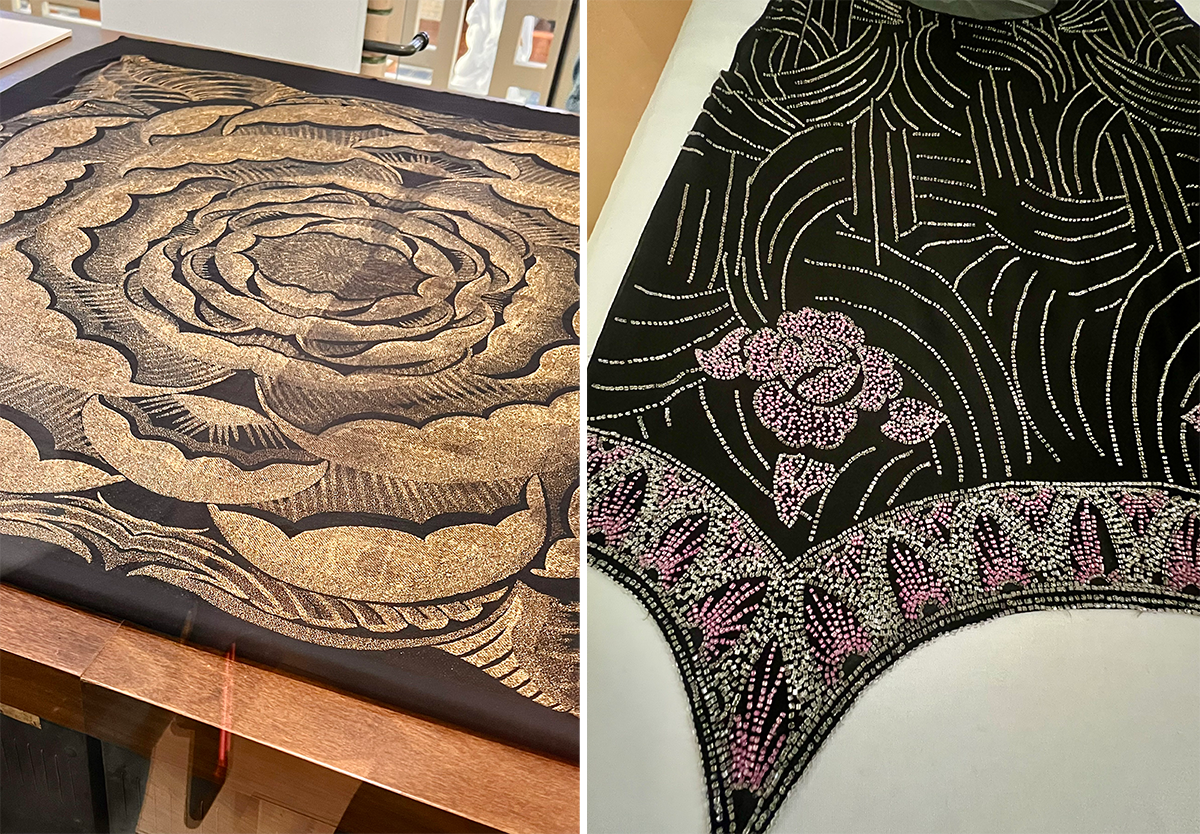 吹き抜けとなっているプールの上階の左右の通路は、美術館のコレクションからの展示を行うスペースである。来年2月15日まで、アール・デコ展100周年を記念して『Folles annés(狂乱の年)、20年代のクローゼット』展を開催中。所蔵品から厳選された1920年代の代表的なスタイルのテキスタイル、デイウエア、ソワレなどをみていると、この時期に流行ったダンスのチャールストンやアール・デコ装飾が施された豪華列車での旅などが目の前で繰り広げられているような気になる。1925年のアール・デコ展ポスターにもみられるが、このスタイルの潮流を代表するモチーフのひとつはバラの花。直線を生かしたグラフィックな花、パブリシティ、ドレス、インテリア、テキスタイル、ジュエリー、ビューティプロダクト、バッグなどのモチーフに生かされている。また、展示の中にはエジプト的モチーフも。1922年にツタンカーメンの墓が発見されたことから、エジプトへ世間は関心を向け、そこからエジプト的モチーフもアール・デコ期にはよくみられるようになったという。